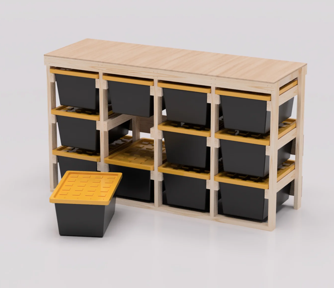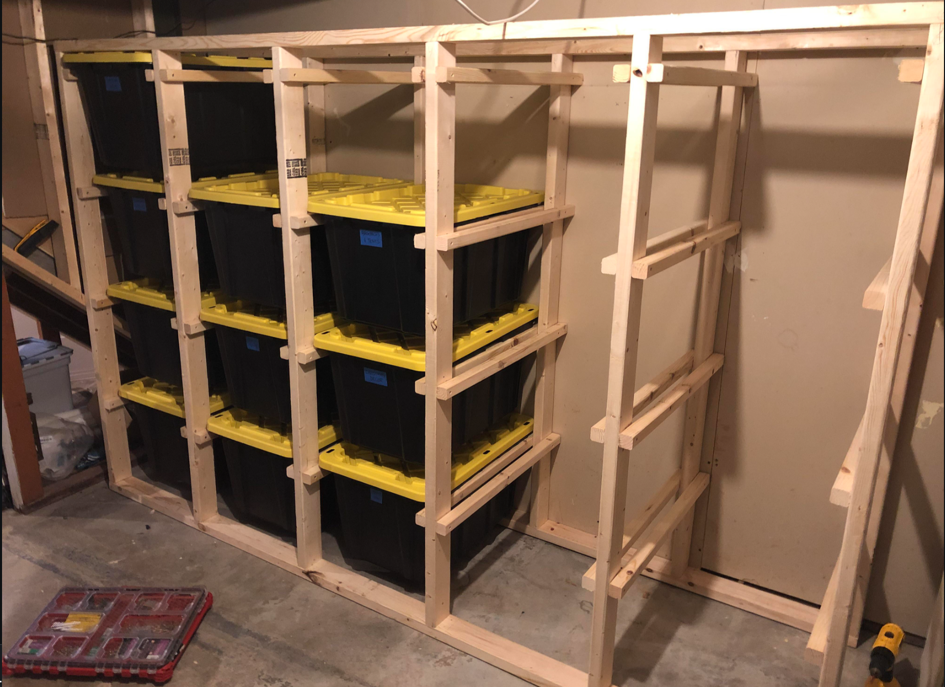 Transform your cluttered garage or basement into a clean, accessible storage wall with our custom Storage Bins Organizer racks. Each rack is built from heavy‑duty 2×4 lumber and precisely sized to your plastic totes, so every bin slides in and out without stacking or wobbling. Choose from layouts of 6 to 25 totes.